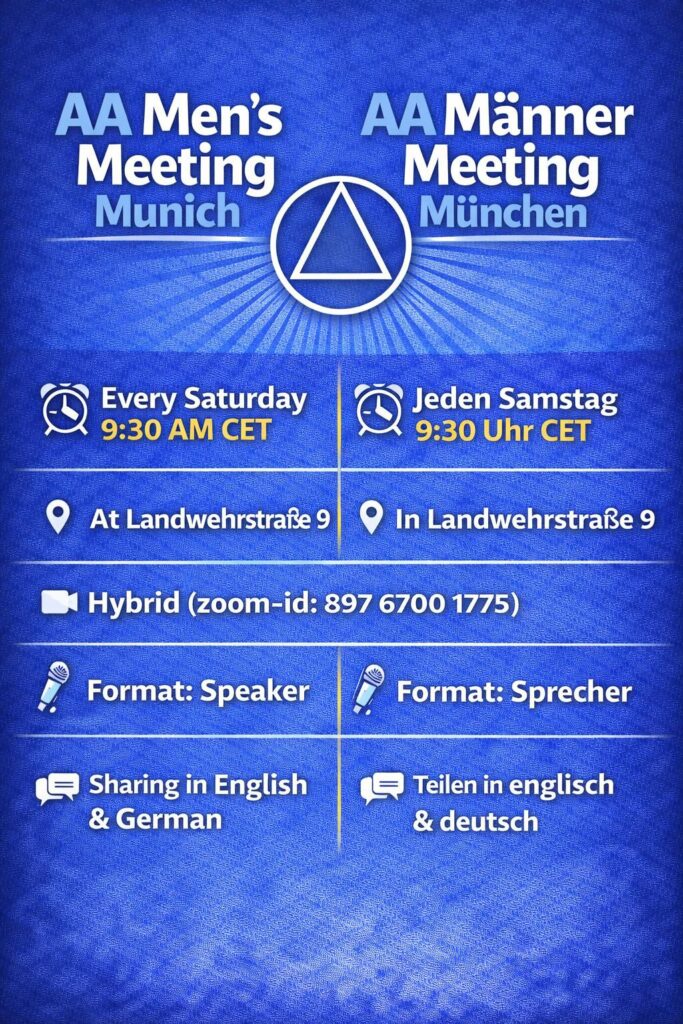 09:30 — BILINGUAL MEN’s GROUP – in-person + Zoom09:30 - 10:30, Closed, Discussion, Meeting Information, Saturday, Speaker, Zoom / By admin From January 2026! You can attend in-person at: Kontaktstelle, Landwehrstraße. 9 Zoom Meeting Link Meeting ID: 897 6700 1775